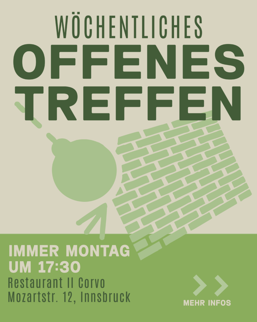 Am 3.12 ist der internationale Tag der Menschen mit Behinderung(en). Bis heute gibt es viel zu viele Barrieren in Innsbruck. Nicht nur physisch – auch in den Köpfen der Menschen, die hier leben. Mit einer Demonstration wollen wir auf diese Unterdrückung aufmerksam machen und für eine Gesellschaft kämpfen, die alle Menschen mitdenkt und wertschätzt.