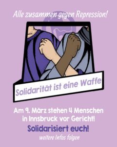 Am 9. März stehen 4 Menschen in Innsbruck vor Gericht. Sie werden im Zuge einer massiven Kriminalisierung der feministischen Bewegung in Innsbruck strafrechtlich angeklagt. Zeigt euch solidarisch! Kommt zum Prozess und zur Kundgebung. Helft mit und sammelt Spenden, denn das alles wird viel Geld kosten.