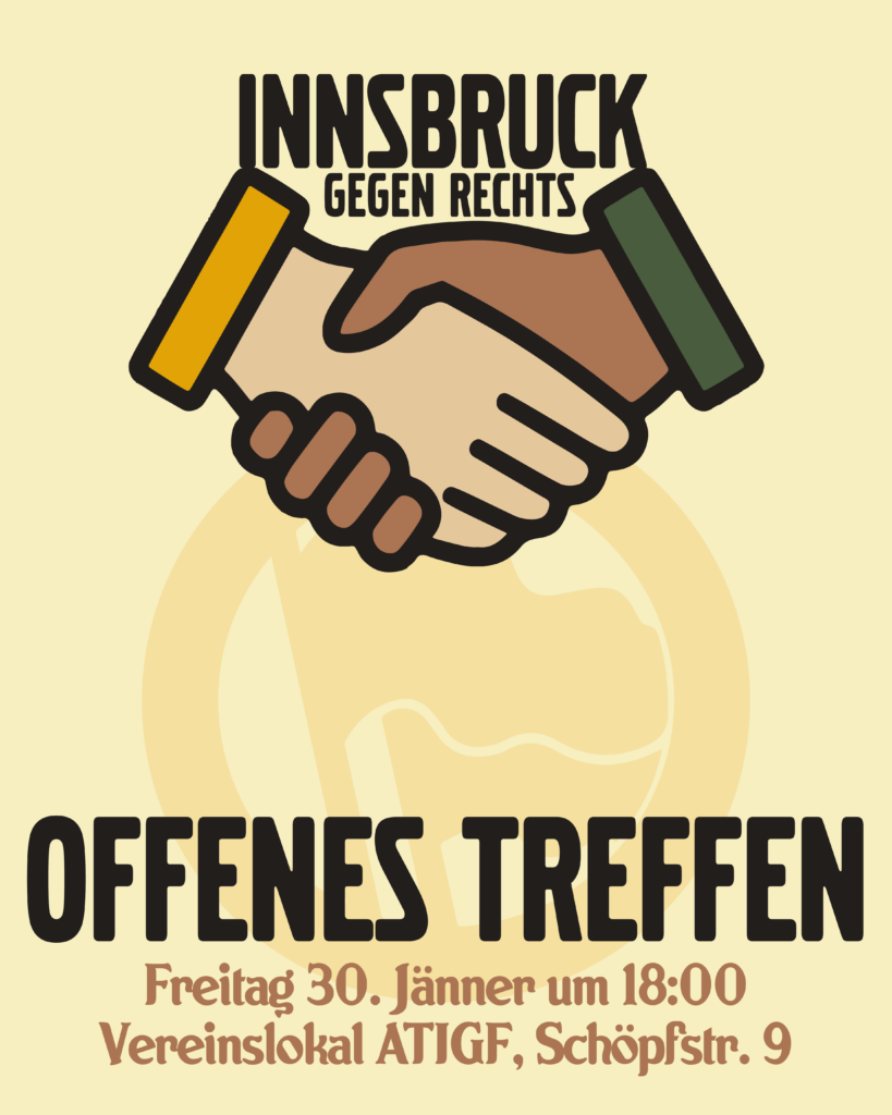 Hier in Innsbruck braucht es ein breites Bündnis all jener Kräfte, die dem aufkommenden Faschismus wirklich etwas entgegensetzen wollen. Deshalb laden wir alle Gruppen, Organisationen und Einzelpersonen, die sich dazu engagieren wollen herzlich ein.Freitag 30.1. um 18:00 im Vereinslokal der ATIGF, Schöpfstr. 9, Innsbruck