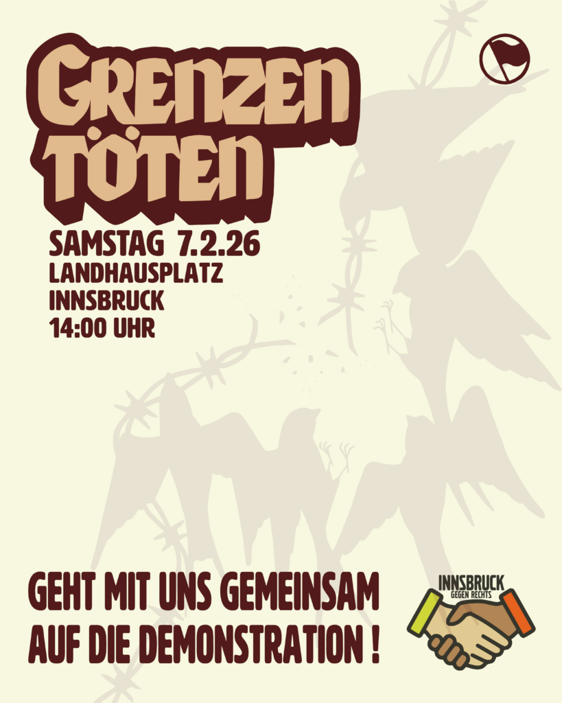 Kommt mit dem Bündnis Innsbruck gegen Rechts zur Grenzen Töten Demo um 14:00 auf dem Landhausplatz Innsbruck und setzt ein Zeichen gegen das europäische Grenzregime!