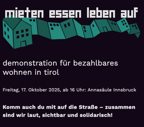 Innsbruck ist die teuerste Stadt Österreichs. In ganz Tirol ist Wohnen kaum erschwinglich – isst Leben auf. Deswegen gehen wir gemeinsam auf die Straße. Betroffen sind alle, die mieten. Deswegen richtet sich der friedliche Zug an Familien, Studierende, Arbeitssuchende, Pensionist*innen, Berufstätige – alle, die sich für Innsbruck dauerhaft leistbares Wohnen wünschen.